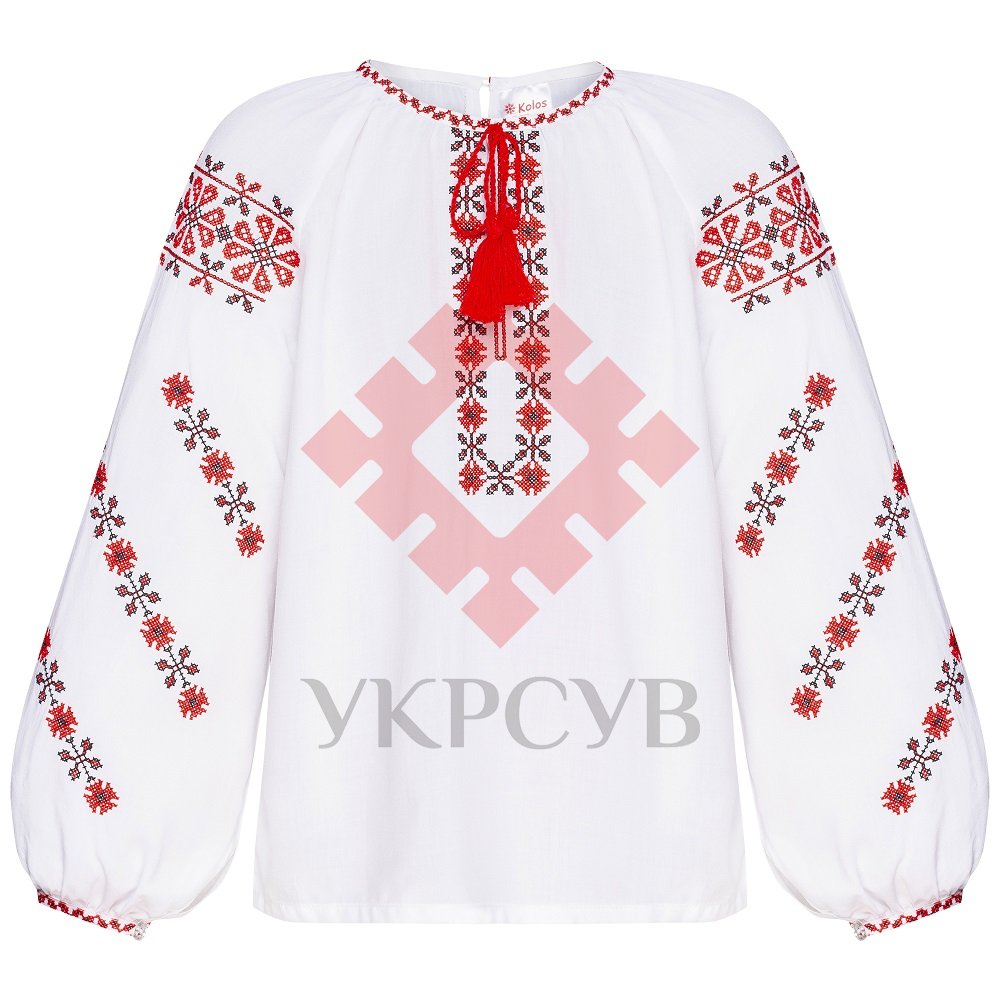 Вишиванка з сучасним, яскравим орнаментом вишивки. Вишивка прикрашає блузу спереду та на рукавах.