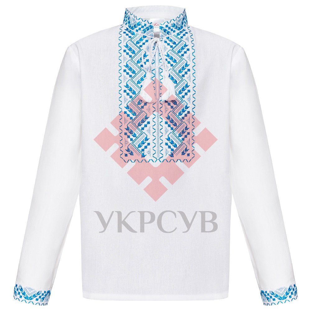 Дитяча вишиванка в білому кольорі поєднала в собі давні традиції, сучасні тенденції та комфорт. Яскраво-блакитна вишивка, виконана гладдю, розміщена спереду сорочки та на рукавах.