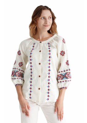 Вишиванка виготовлена з натурального 100% льону білого кольору. Традиційна вишивка гладдю прикрашає вишиванку спереду та на рукавах.
