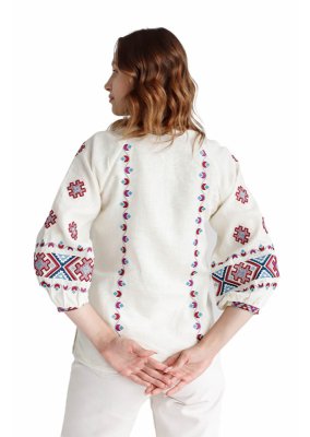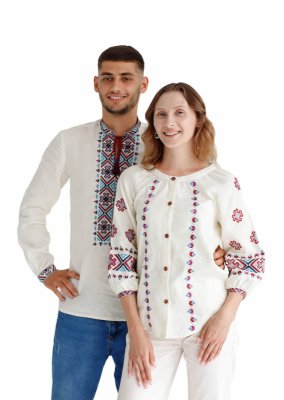 Вишиванка виготовлена з натурального 100% льону білого кольору. Традиційна вишивка гладдю прикрашає вишиванку спереду та на рукавах.