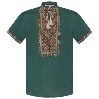 Сорочка пошита з високоякісного льону насиченого зеленого кольору (100%) та прикрашена традиційним візерунком, що виконаний у техніці "хрестик".