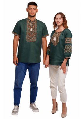 Сорочка пошита з високоякісного льону насиченого зеленого кольору (100%) та прикрашена традиційним візерунком, що виконаний у техніці "хрестик".