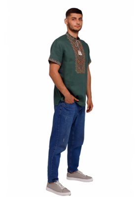 Сорочка пошита з високоякісного льону насиченого зеленого кольору (100%) та прикрашена традиційним візерунком, що виконаний у техніці "хрестик".