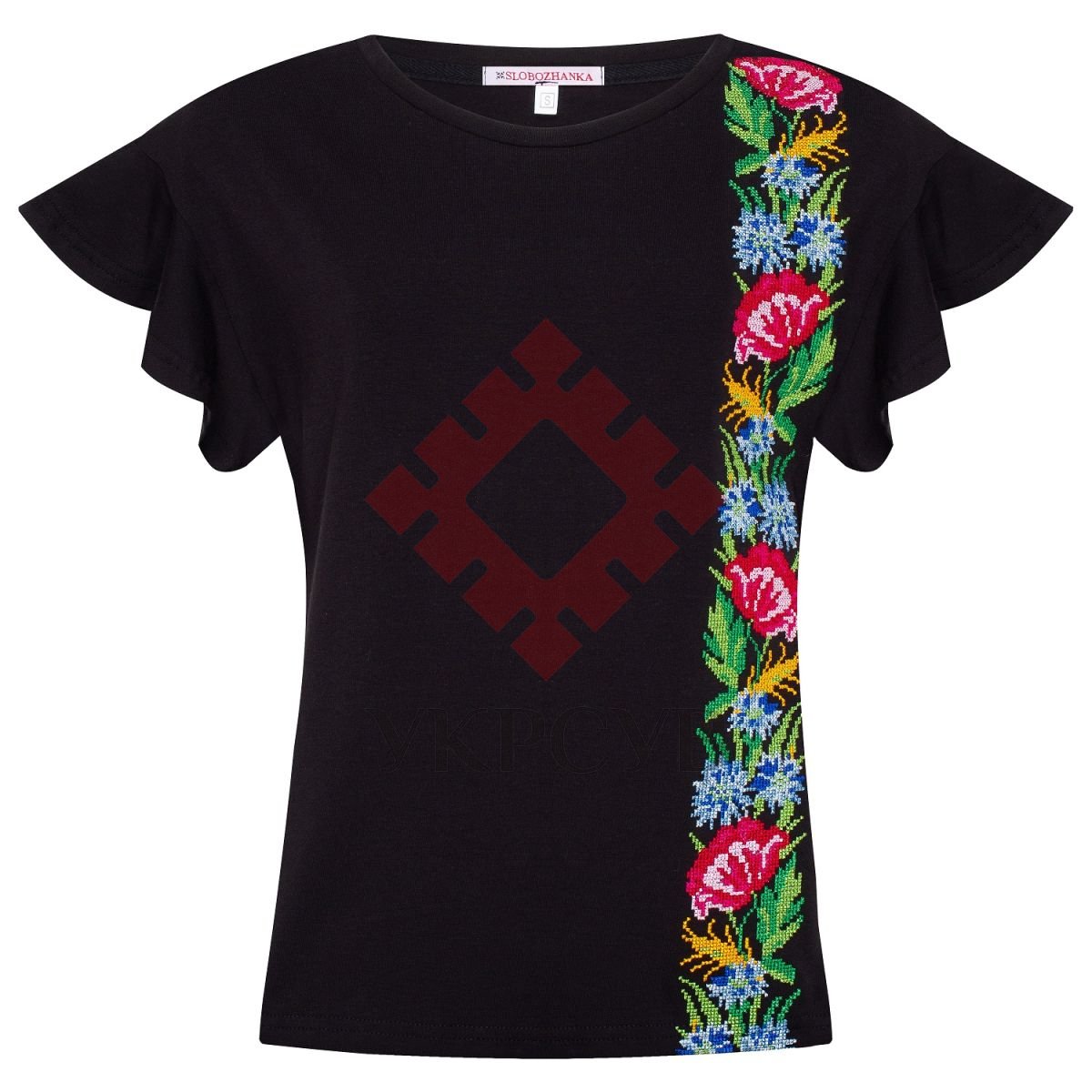 Така футболка стане стильним колоритним доповненням Вашого гардеробу. Яскрава вишивка квіткових візерунків виконана у техніці "хрестик".