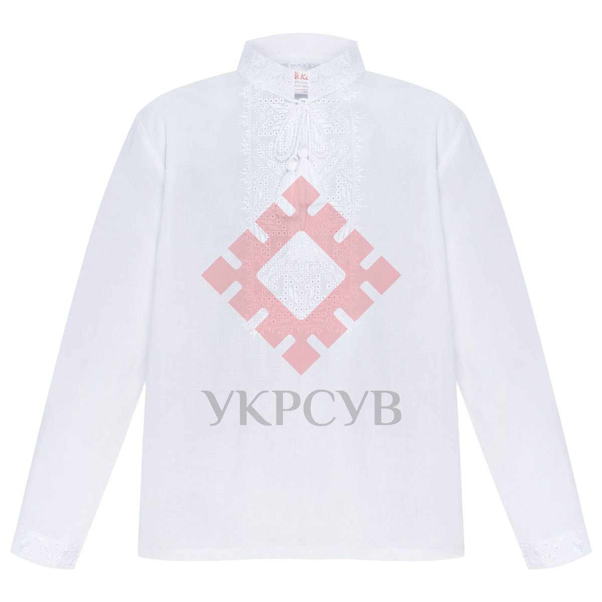 Дитяча вишиванка в білому кольорі поєднала в собі давні традиції та сучасні тенденції. Візерунок, в основу якого покладені давні обереги та символи, що приносять удачу - ромб та зірка, розміщені спереду сорочки та на рукавах. Візерунок виконаний машинною вишивкою у техніці "гладь".
