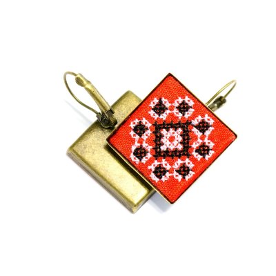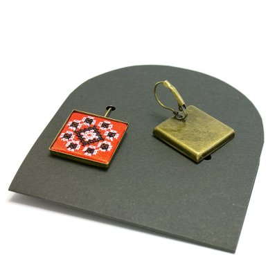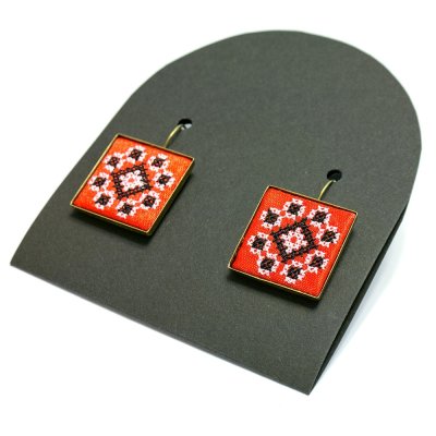 Декоративна особливість сережок – вишита платформочка розміром 25х25мм, яка виготовлена із чорного сатину та вишита білими та червоними нитками.