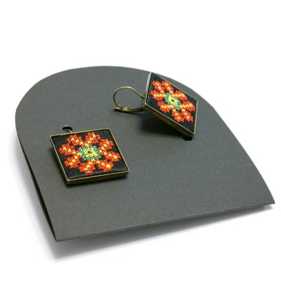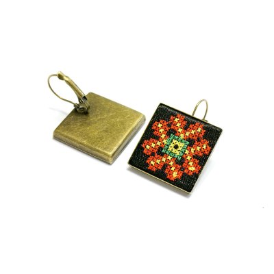 Декоративна особливість сережок – вишита платформочка розміром 25х25мм, яка виготовлена із чорного сатину та вишита білими та червоними нитками.