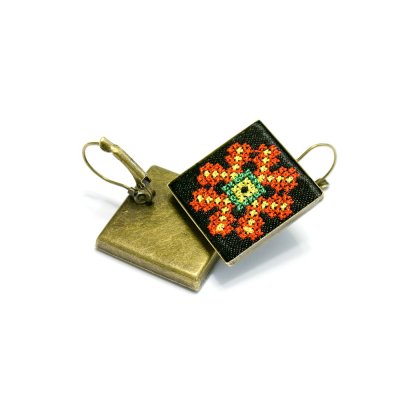 Вишиті сережки "Чарівниця" виготовлені з металу, тонованого під колір латуні. Застібка має фіксатор для більш надійної фіксації.