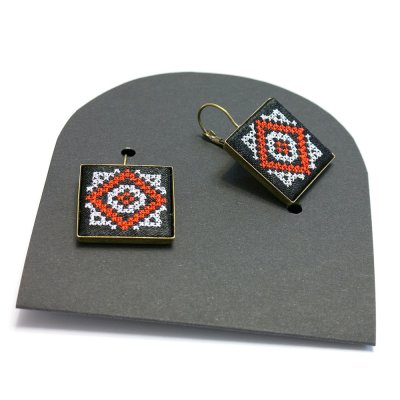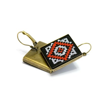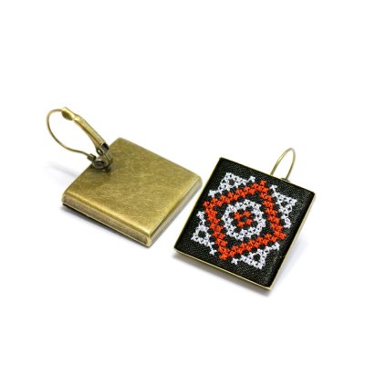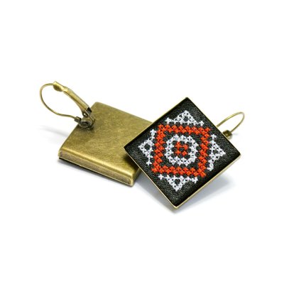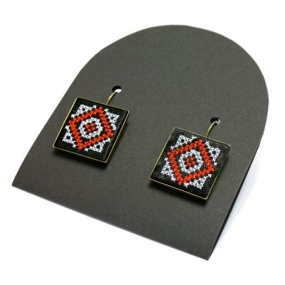 Декоративна особливість сережок – вишита платформочка розміром 25х25мм, яка виготовлена із чорного сатину та вишита білими та червоними нитками.