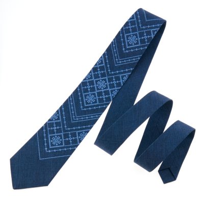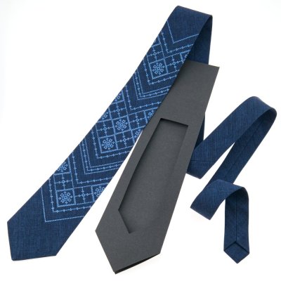 Вишита краватка – це унікальний подарунок для керівника, друга чи колеги по роботі. Вона є необхідним аксесуаром для ділової людини. Краватка виготовлена з костюмної тканини синього кольору, класичного крою. Довжина виробу – 145 см.