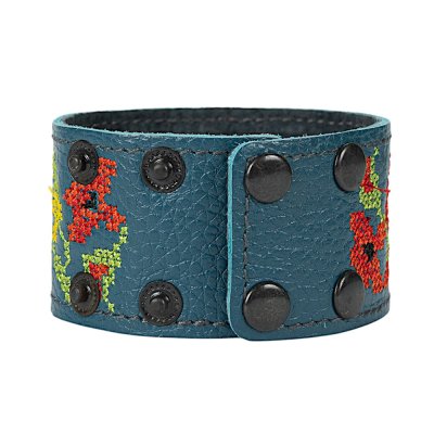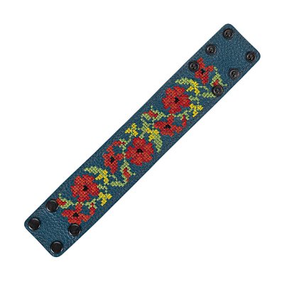 Браслет виготовлений з натуральної шкіри, що гарантує його високу якість, довговічність та комфортне носіння. Основа прикрашена яскравою та чіткою машинною вишивкою, виконаною з особливою увагою до деталей, що відтворює багаті орнаменти української вишивки. Кожен візерунок несе в собі глибокий символізм, роблячи браслет не просто прикрасою, а справжнім оберегом.