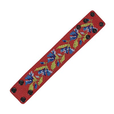 Браслет виготовлений з натуральної шкіри, що гарантує його високу якість, довговічність та комфортне носіння. Основа прикрашена яскравою та чіткою машинною вишивкою, виконаною з особливою увагою до деталей, що відтворює багаті орнаменти української вишивки. Кожен візерунок несе в собі глибокий символізм, роблячи браслет не просто прикрасою, а справжнім оберегом.
