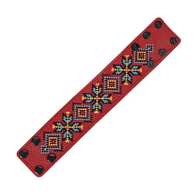 Браслет виготовлений з натуральної шкіри, що гарантує його високу якість, довговічність та комфортне носіння. Основа прикрашена яскравою та чіткою машинною вишивкою, виконаною з особливою увагою до деталей, що відтворює багаті орнаменти української вишивки. Кожен візерунок несе в собі глибокий символізм, роблячи браслет не просто прикрасою, а справжнім оберегом.