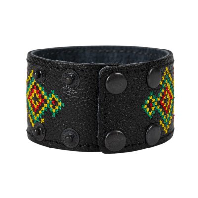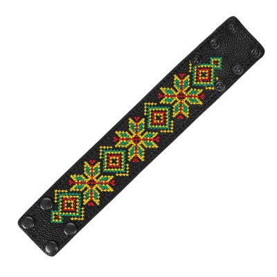 Браслет виготовлений з натуральної шкіри, що гарантує його високу якість, довговічність та комфортне носіння. Основа прикрашена яскравою та чіткою машинною вишивкою, виконаною з особливою увагою до деталей, що відтворює багаті орнаменти української вишивки. Кожен візерунок несе в собі глибокий символізм, роблячи браслет не просто прикрасою, а справжнім оберегом.