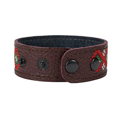 Браслет виготовлений з натуральної шкіри, що гарантує його високу якість, довговічність та комфортне носіння. Основа прикрашена яскравою та чіткою машинною вишивкою, виконаною з особливою увагою до деталей, що відтворює багаті орнаменти української вишивки. Кожен візерунок несе в собі глибокий символізм, роблячи браслет не просто прикрасою, а справжнім оберегом.