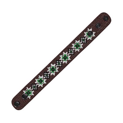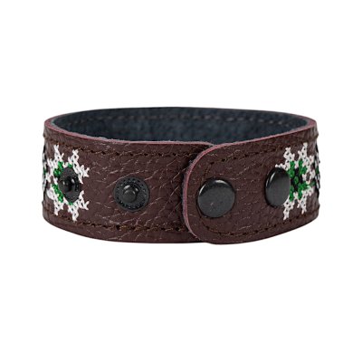 Браслет виготовлений з натуральної шкіри, що гарантує його високу якість, довговічність та комфортне носіння. Основа прикрашена яскравою та чіткою машинною вишивкою, виконаною з особливою увагою до деталей, що відтворює багаті орнаменти української вишивки. Кожен візерунок несе в собі глибокий символізм, роблячи браслет не просто прикрасою, а справжнім оберегом.