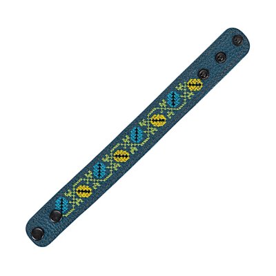 Браслет виготовлений з натуральної шкіри, що гарантує його високу якість, довговічність та комфортне носіння. Основа прикрашена яскравою та чіткою машинною вишивкою, виконаною з особливою увагою до деталей, що відтворює багаті орнаменти української вишивки. Кожен візерунок несе в собі глибокий символізм, роблячи браслет не просто прикрасою, а справжнім оберегом.