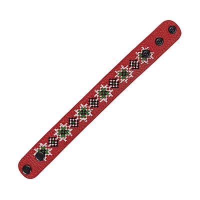 Браслет виготовлений з натуральної шкіри, що гарантує його високу якість, довговічність та комфортне носіння. Основа прикрашена яскравою та чіткою машинною вишивкою, виконаною з особливою увагою до деталей, що відтворює багаті орнаменти української вишивки. Кожен візерунок несе в собі глибокий символізм, роблячи браслет не просто прикрасою, а справжнім оберегом.