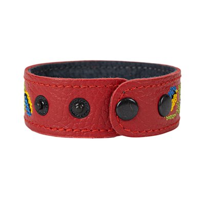 Браслет виготовлений з натуральної шкіри, що гарантує його високу якість, довговічність та комфортне носіння. Основа прикрашена яскравою та чіткою машинною вишивкою, виконаною з особливою увагою до деталей, що відтворює багаті орнаменти української вишивки. Кожен візерунок несе в собі глибокий символізм, роблячи браслет не просто прикрасою, а справжнім оберегом.