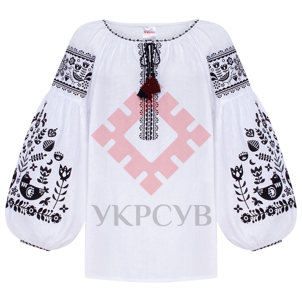 Горловина оздоблена елегантними чорними китицями, які довершують образ та підкреслюють автентичність вишиванки. Об'ємні рукави, зібрані на манжети, надають моделі витонченості та комфорту.