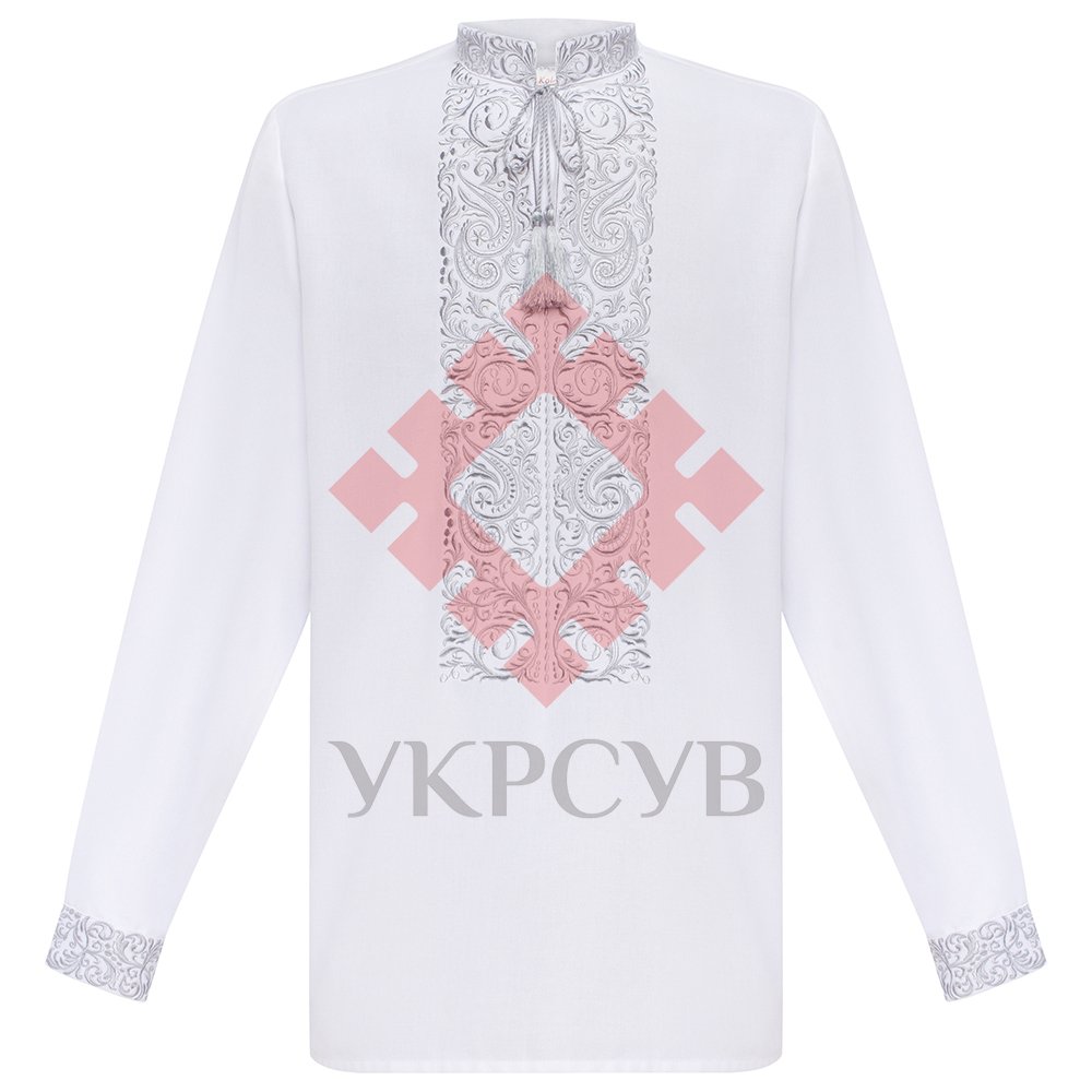 Вишиванка виконана на білосніжній тканині, що символізує чистоту та урочистість. Головною окрасою Кольорової є багата **машинна вишивка**, виконана у витончених сіро-сріблястих відтінках. Центральна частина вишиванки прикрашена пишним вертикальним орнаментом, що складається зі складних рослинних мотивів, завитків та елементів, які надають виробу особливої глибини та елегантності. Цей же вишуканий візерунок повторюється на комірі-стійці та манжетах, створюючи гармонійну композицію.