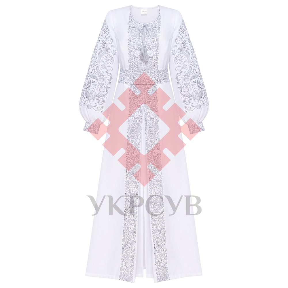 Сукня виконана у білосніжному кольорі, який підкреслює вишуканість та чистоту дизайну. Головною окрасою Ажурної симфонії є багата **машинна вишивка** у сріблясто-сірих відтінках, що створює ефект витонченого мережива. Складні рослинні та геометричні візерунки прикрашають передню частину сукні, рукави та пояс, що зав'язується. Особливу увагу привертає вертикальна смуга вишивки, що проходить по центру переду, візуально видовжуючи силует та додаючи величі.