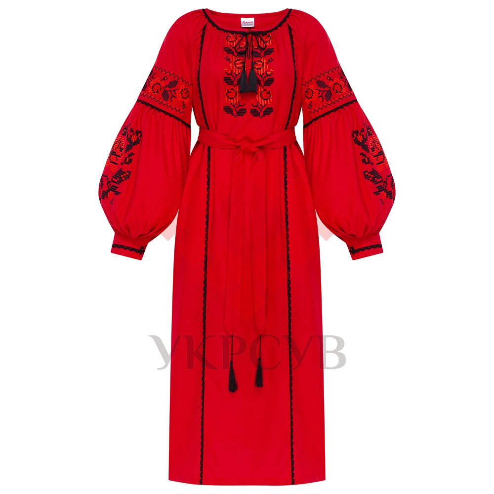 Сукня виконана у насиченому червоному кольорі, що символізує життєву енергію, красу та пристрасть. Головною окрасою Королеви квітів є багата **машинна вишивка** у контрастних чорних відтінках. На грудях розташовані пишні квіткові композиції, що символізують родючість та розквіт. Ці ж мотиви повторюються на широких рукавах-реглан, що закінчуються витонченими манжетами, та вздовж усієї довжини сукні, створюючи гармонійний та завершений образ.
