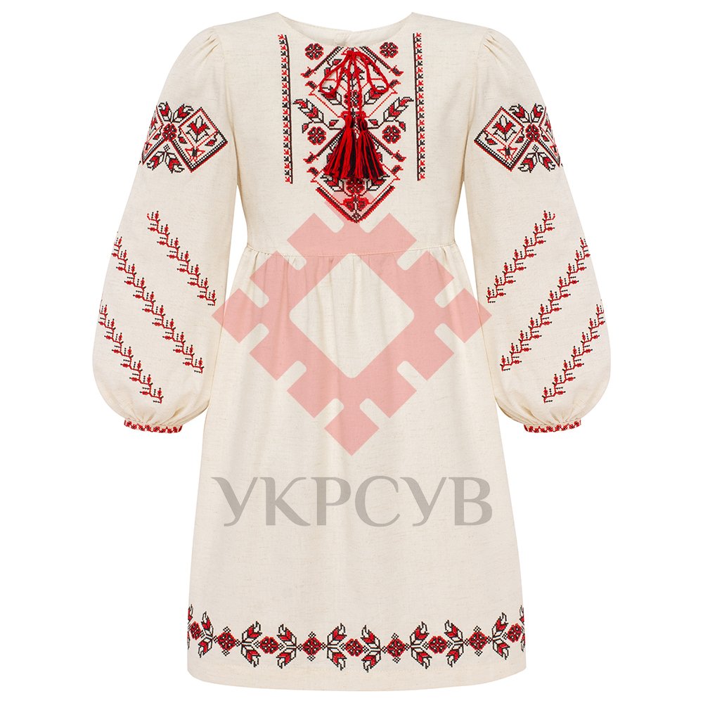 Сукня пошита з якісної тканини світлого, природного кольору, що нагадує про льон або неосвітлену бавовну, забезпечуючи комфорт та легкість. Головною прикрасою є багата машинна вишивка, виконана у класичних червоно-чорних кольорах. На грудях розташований пишний геометричний орнамент з елементами, що розходяться до плечей, додаючи виробу вишуканості. Рукави-ліхтарики прикрашені рядами дрібних, стилізованих "деревець" або "символів життя", які надають сукні особливого шарму та динаміки.
