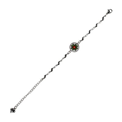 Браслет має витончений металевий ланцюжок сріблястого кольору, що складається з хвилястих елементів, які додають виробу оригінальності та легкості. У центрі композиції розташований круглий медальйон, що обрамляє мініатюрну ручну вишивку хрестиком. Візерунок виконаний у традиційних червоно-чорних кольорах, що символізують любов, життєву енергію та захист.