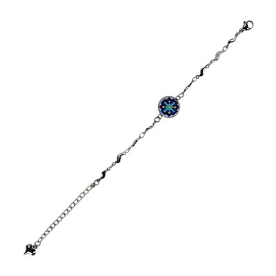 Браслет має витончений металевий ланцюжок сріблястого кольору, що складається з хвилястих елементів, які додають виробу оригінальності та легкості. У центрі композиції розташований круглий медальйон, що обрамляє мініатюрну ручну вишивку хрестиком. Візерунок виконаний у традиційних червоно-чорних кольорах, що символізують любов, життєву енергію та захист.