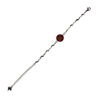 Браслет має витончений металевий ланцюжок сріблястого кольору, що складається з хвилястих елементів, які додають виробу оригінальності та легкості. У центрі композиції розташований круглий медальйон, що обрамляє мініатюрну ручну вишивку хрестиком. Візерунок виконаний у традиційних червоно-чорних кольорах, що символізують любов, життєву енергію та захист.