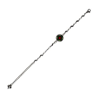 Браслет має витончений металевий ланцюжок сріблястого кольору, що складається з хвилястих елементів, які додають виробу оригінальності та легкості. У центрі композиції розташований круглий медальйон, що обрамляє мініатюрну ручну вишивку хрестиком. Візерунок виконаний у традиційних червоно-чорних кольорах, що символізують любов, життєву енергію та захист.