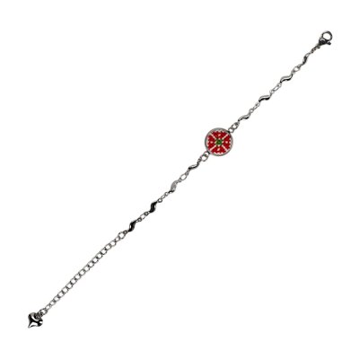 Браслет має витончений металевий ланцюжок сріблястого кольору, що складається з хвилястих елементів, які додають виробу оригінальності та легкості. У центрі композиції розташований круглий медальйон, що обрамляє мініатюрну ручну вишивку хрестиком. Візерунок виконаний у традиційних червоно-чорних кольорах, що символізують любов, життєву енергію та захист.