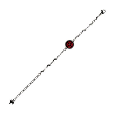 Браслет має витончений металевий ланцюжок сріблястого кольору, що складається з хвилястих елементів, які додають виробу оригінальності та легкості. У центрі композиції розташований круглий медальйон, що обрамляє мініатюрну ручну вишивку хрестиком. Візерунок виконаний у традиційних червоно-чорних кольорах, що символізують любов, життєву енергію та захист.