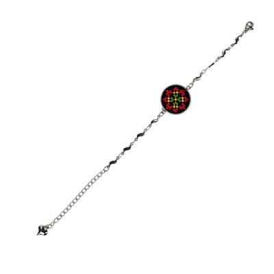 Браслет має витончений металевий ланцюжок сріблястого кольору, що складається з хвилястих елементів, які додають виробу оригінальності та легкості. У центрі композиції розташований круглий медальйон, що обрамляє мініатюрну ручну вишивку хрестиком. Візерунок виконаний у традиційних червоно-чорних кольорах, що символізують любов, життєву енергію та захист.