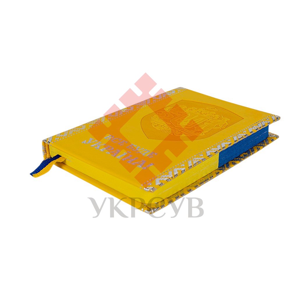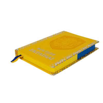 - Він виготовлений в українському стилі. На форзацах герольдична мапа України та карта з видатними українцями, гімн.