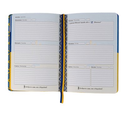 - Блокнот має комбінований внутрішній блок: сторінки в точку та планінг тижня, розрахований на рік.