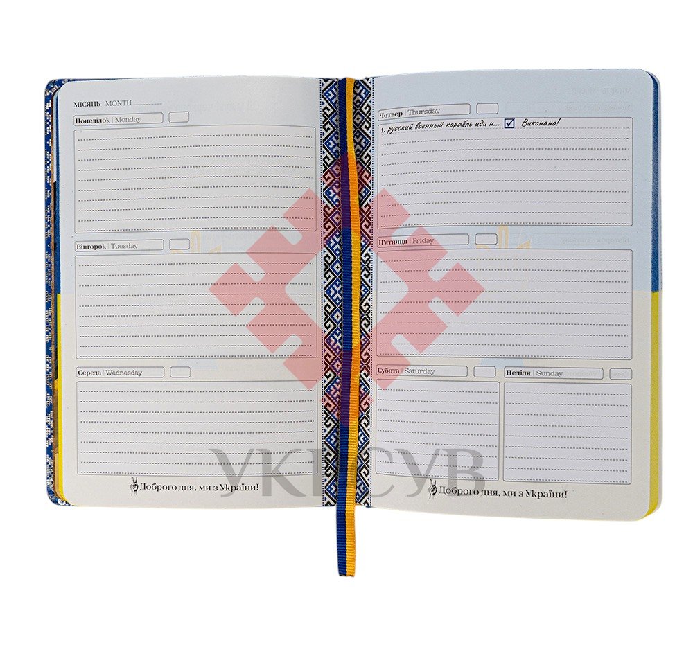 - Блокнот має комбінований внутрішній блок: сторінки в точку та планінг тижня, розрахований на рік.