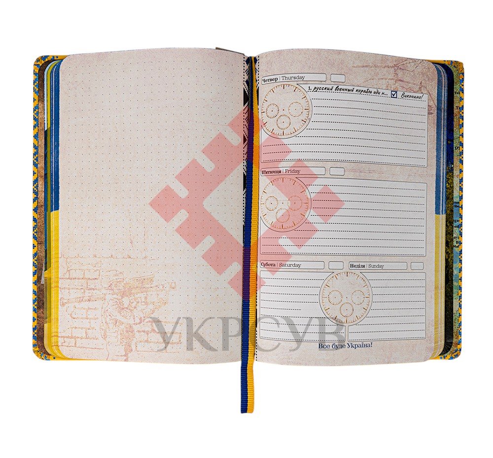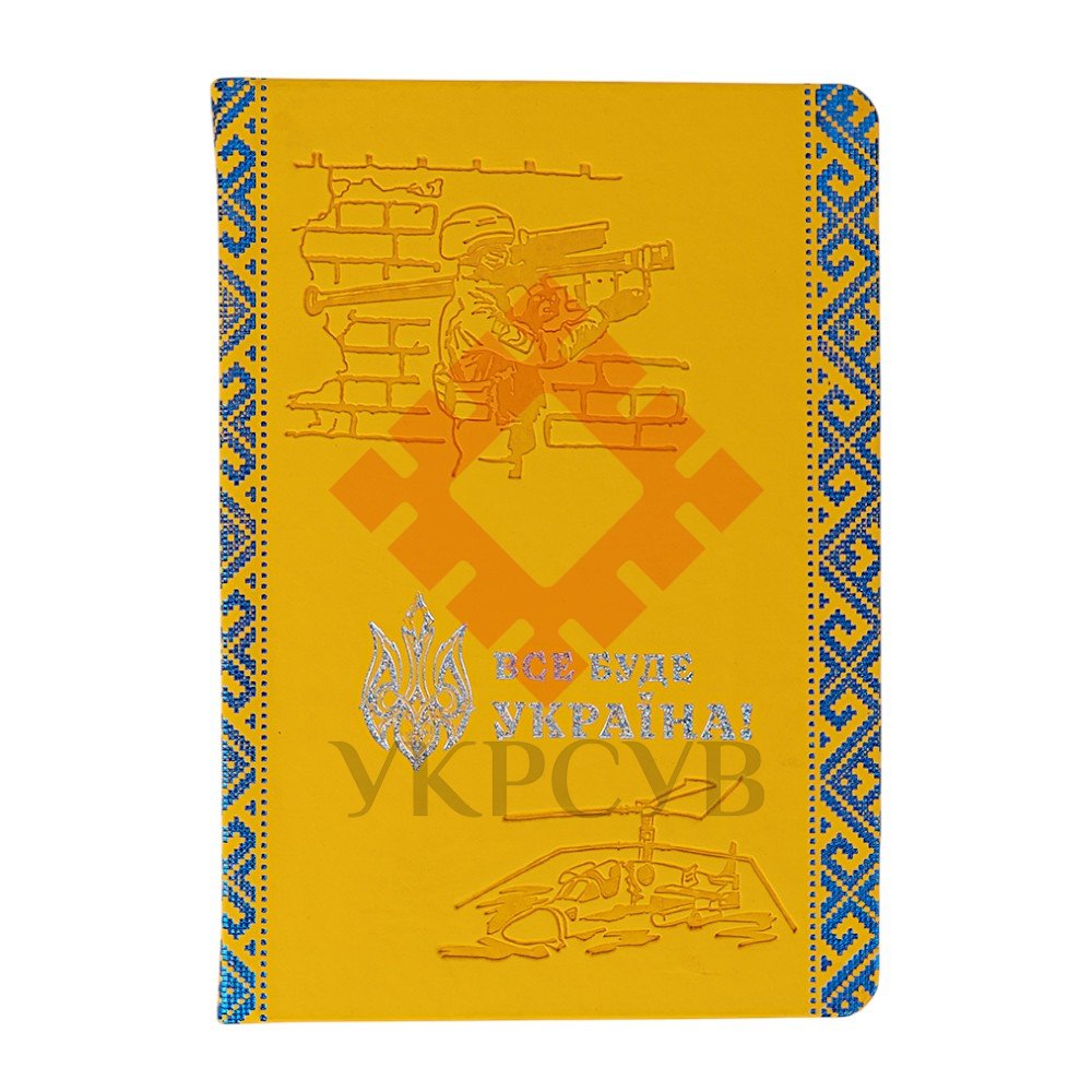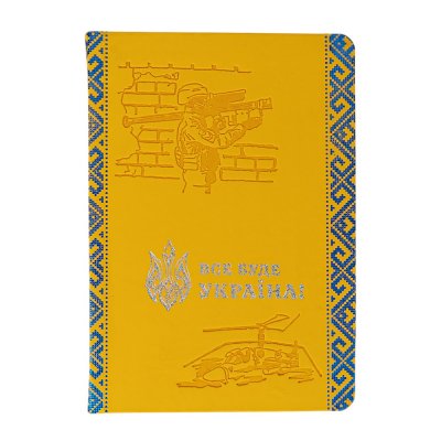 - Обкладинка блокнота з тиснення воїна зі стінгером та підбитим гелікоптером, прикрашена написом "Все буде Україна!".