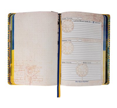 - Блокнот має комбінований внутрішній блок: сторінки в точку та планінг тижня, розрахований на рік.