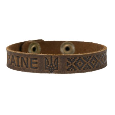Стильний шкіряний браслет стане яскравим аксесуаром для щоденного образу та символом патріотичної підтримки України. Виріб виконаний із натуральної шкіри, прикрашений тисненням з написом Ukraine, гербом та орнаментом у національному стилі.