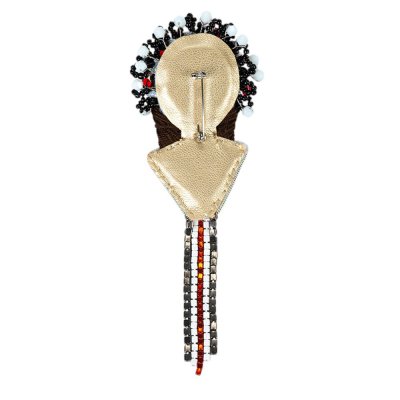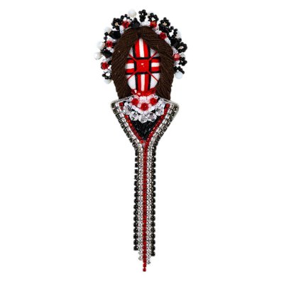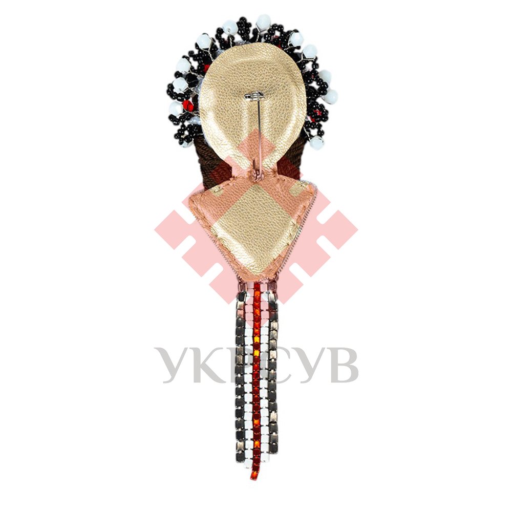 - Елегантний дизайн: Брошка виконана в строгій чорно-червоній кольоровій гамі з елементами білого та сріблястого відтінку, що робить її універсальним аксесуаром для будь-якого образу. Вона прикрашена вишивкою хрестиком, що імітує народні візерунки, а також елементами з бісеру та намистин, що додають виробу елегантності та блиску.