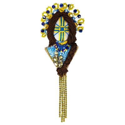 Стильна брошка-мотанка у національних кольорах — це поєднання українських традицій і сучасного дизайну. Її обличчя прикрашене хрестом у жовто-блакитних відтінках, що символізують гармонію, силу духу та любов до рідної землі.