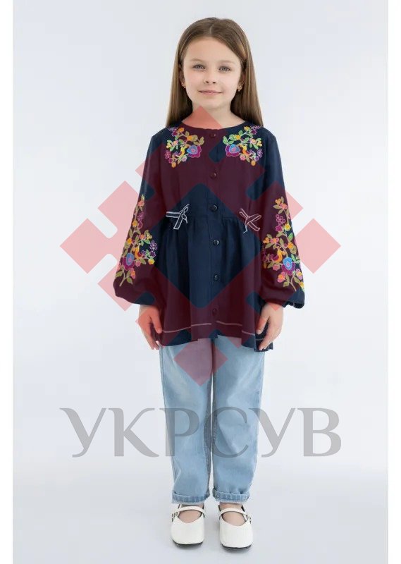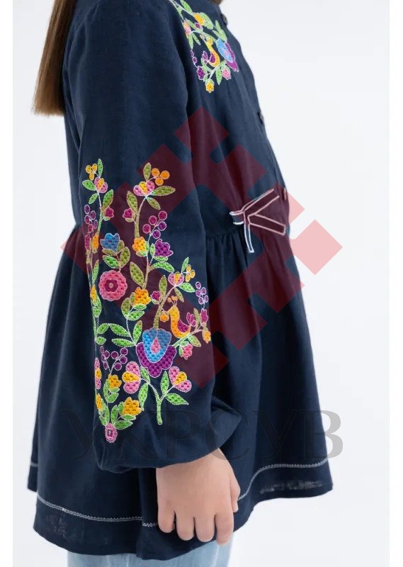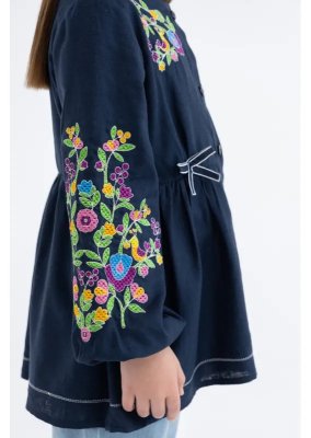 - Дизайн: Глибокий темно-синій фон чудово контрастує з багатоколірною вишивкою на грудях і рукавах.