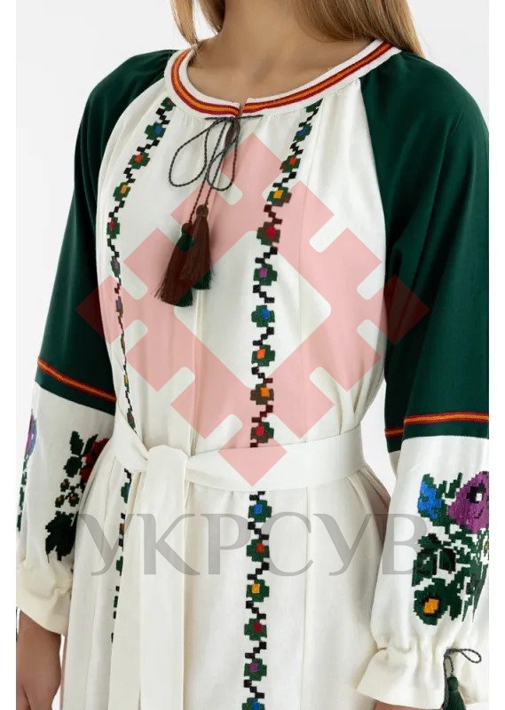 - Орнамент: Рослинна різноколірна вишивка прикрашає рукави, поділ і передню частину сукні, додаючи образу святковості.