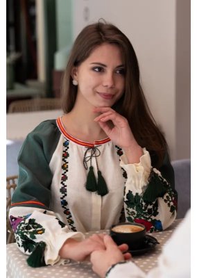 - Дизайн: Вершкове полотно гармонійно поєднане з глибоким зеленим кольором рукавів-регланів, утворюючи неповторний контраст.