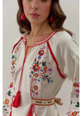 - Декор і крій: Пишні рукави з вишивкою, пояс з китицями, бахрома по низу та оздоблення червоним кантом створюють гармонійний, святковий образ.