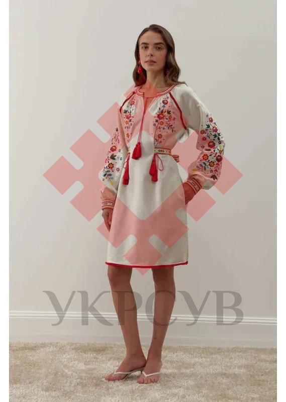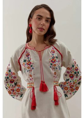 - Декор і крій: Пишні рукави з вишивкою, пояс з китицями, бахрома по низу та оздоблення червоним кантом створюють гармонійний, святковий образ.