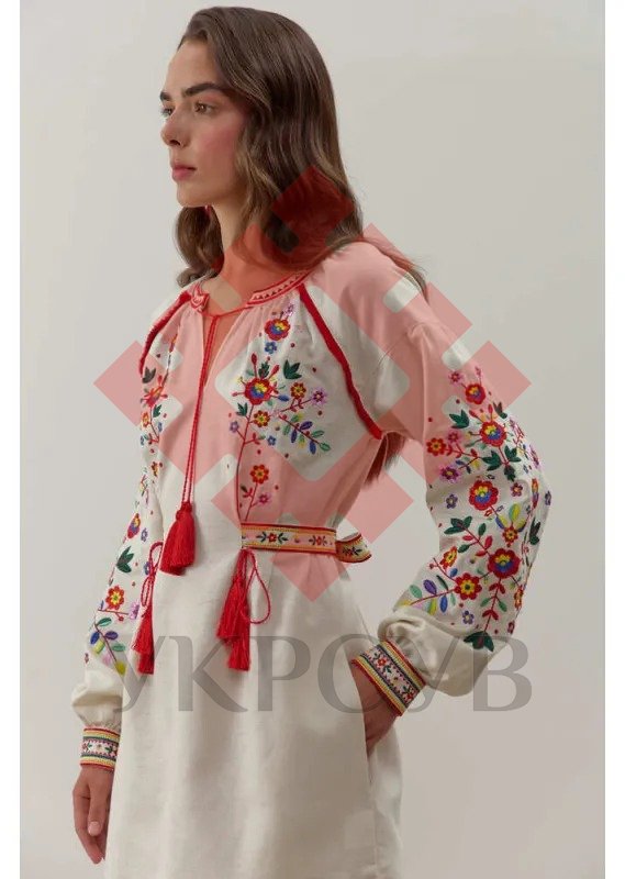 - Декор і крій: Пишні рукави з вишивкою, пояс з китицями, бахрома по низу та оздоблення червоним кантом створюють гармонійний, святковий образ.