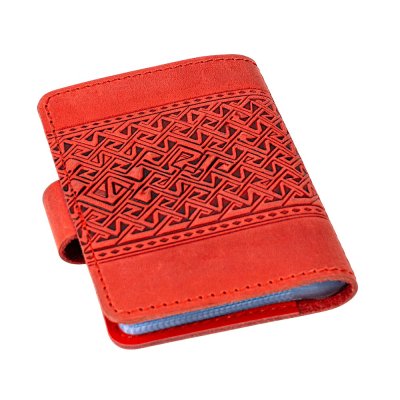 Червона шкіряна візитниця з тисненим тризубом і геометричним орнаментом створена для тих, хто любить яскраві акценти та символічні деталі. Насичений червоний відтінок робить аксесуар помітним і стильним, а натуральна шкіра забезпечує приємну фактуру та стійкість до щоденного використання.